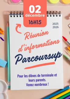 Parcoursup : Une réunion d’informations est prévue le mardi 2 décembre à 16h15 pour les élèves de terminale et leurs parents. Venez nombreux !