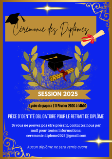 Le Lycée de Papara a le plaisir d’inviter les diplômés de la session 2025 à la cérémonie officielle de remise des diplômes.