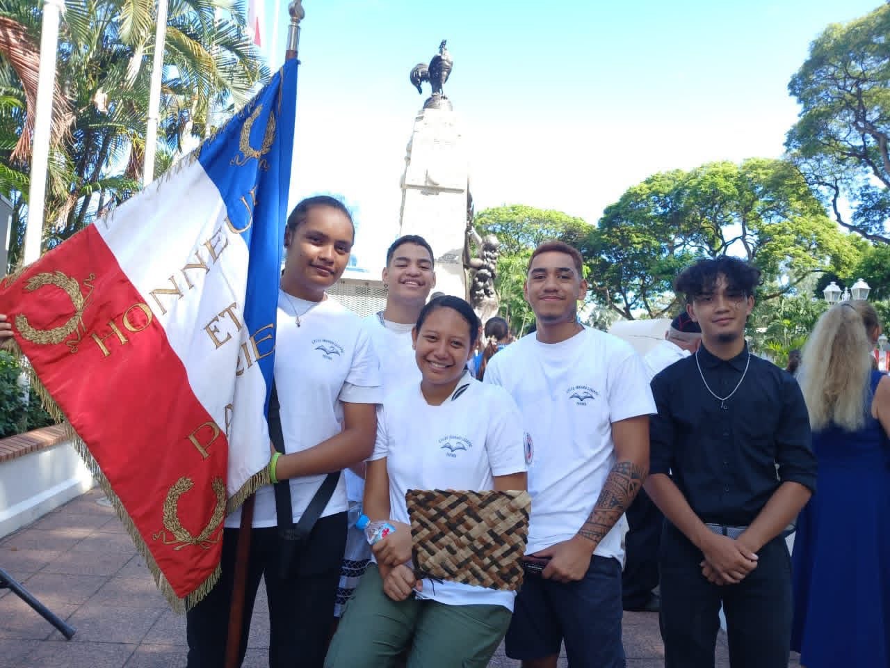 À l’occasion de la commémoration du 11 novembre, quatre élèves de la classe TBP HPS — Tevaipoe URIMA (notre porte drapeau), Hereaniterai FAOA, Ariihau MAETA,Moerai BANNER— ainsi qu’un élève de Première STL, Oahu KAHUEINUI ont représenté le lycée lors de la cérémonie au monument aux morts de Papeete. Par leur présence et leur engagement, ces élèves ont contribué à entretenir le devoir de mémoire et à honorer les soldats tombés pour la France. Ils ont ainsi rappelé l’importance de la citoyenneté, du respect de l’Histoire et de la transmission des valeurs républicaines au sein de notre communauté scolaire. Merci à M. le proviseur et Mme Holstein pour leur accompagnement.