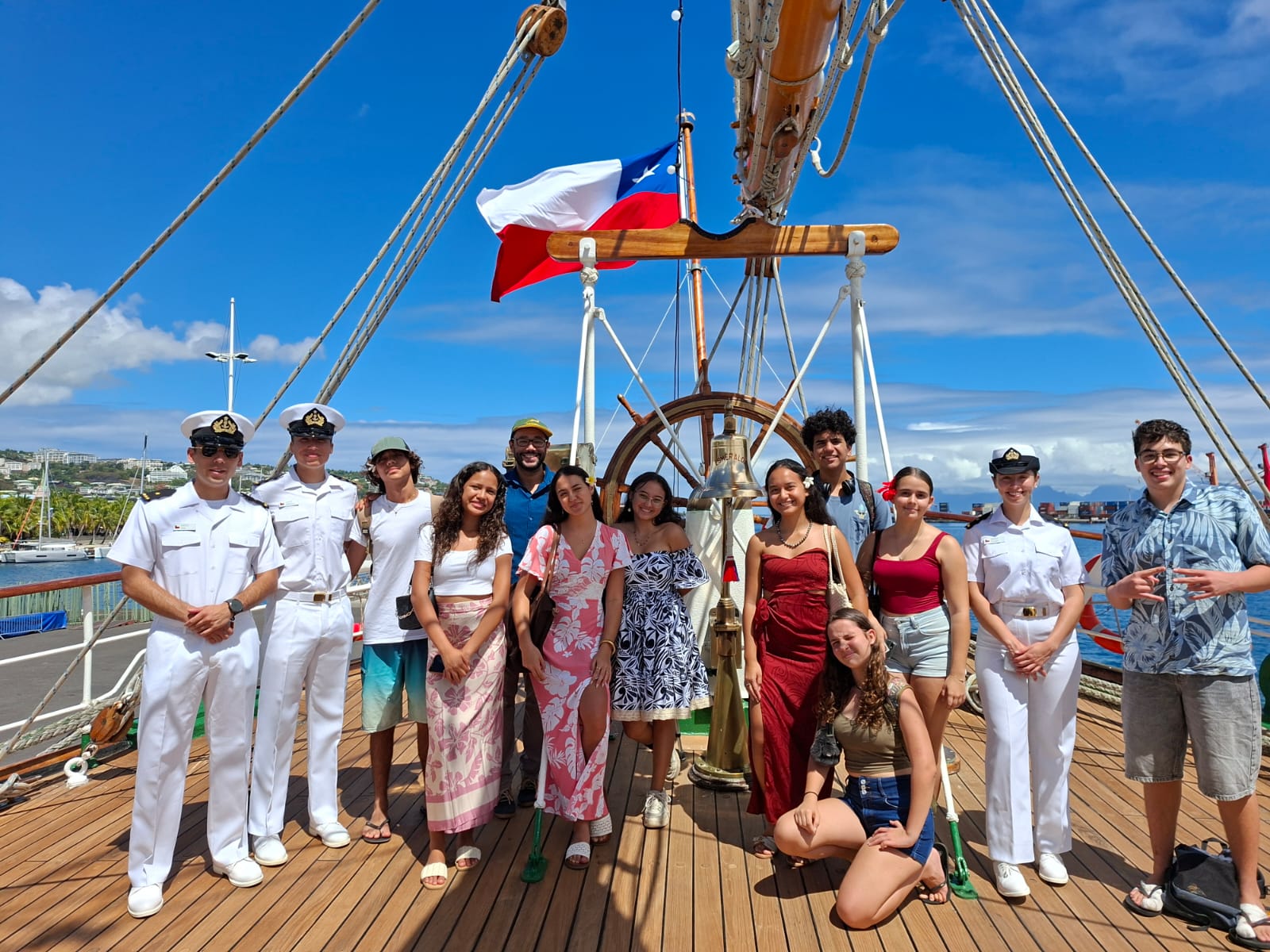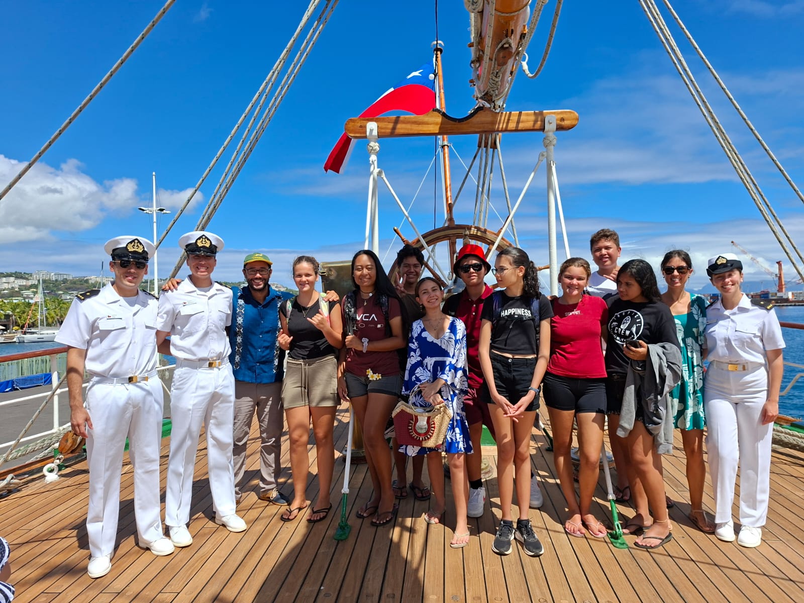 Le 10 septembre, les élèves de LLCE espagnol et de 2de, 1ere et Terminale euro espagnol ont eu la chance de visiter le bateau école chilien Esmeralda qui a fait escale dans le port de Papeete.